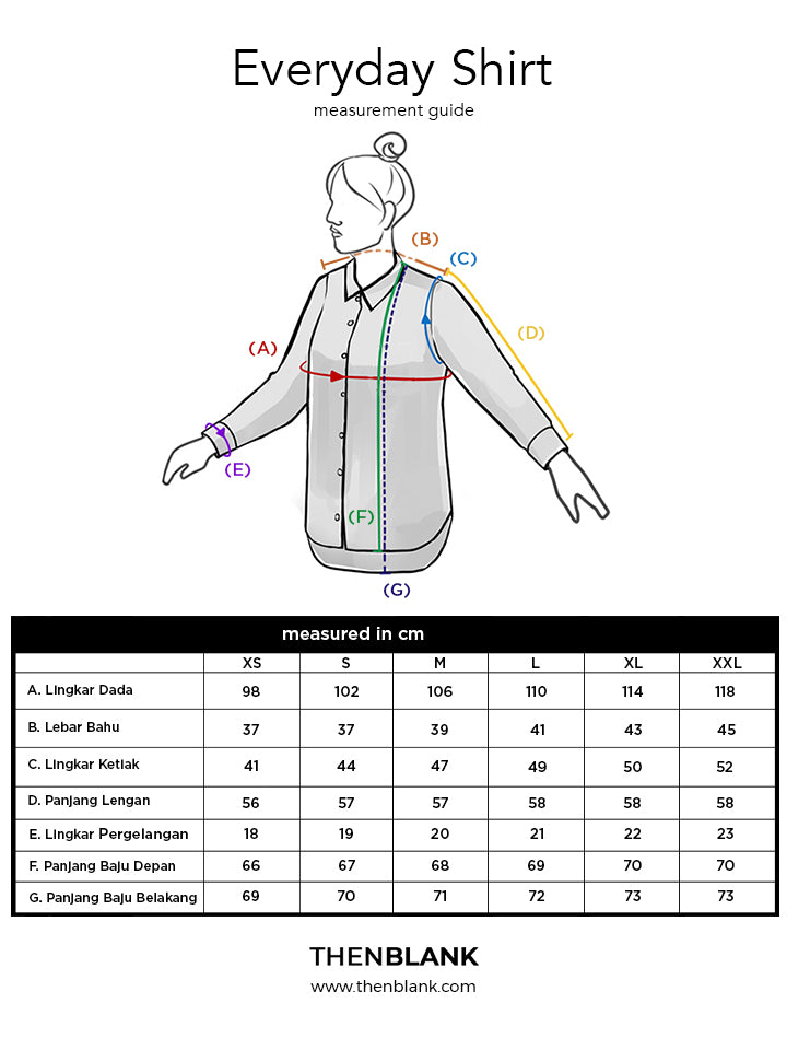 Kemeja daily dengan regular fit cutting. Kancing warna senada, di bagian depan dan opening sleeve. Materialnya sangat lembut dan tidak mudah kusut. Dapat dikenakan langsung atau dijadikan outer untuk kesan yang lebih santai. Mudah dipadupadankan dengan outfit lainnya