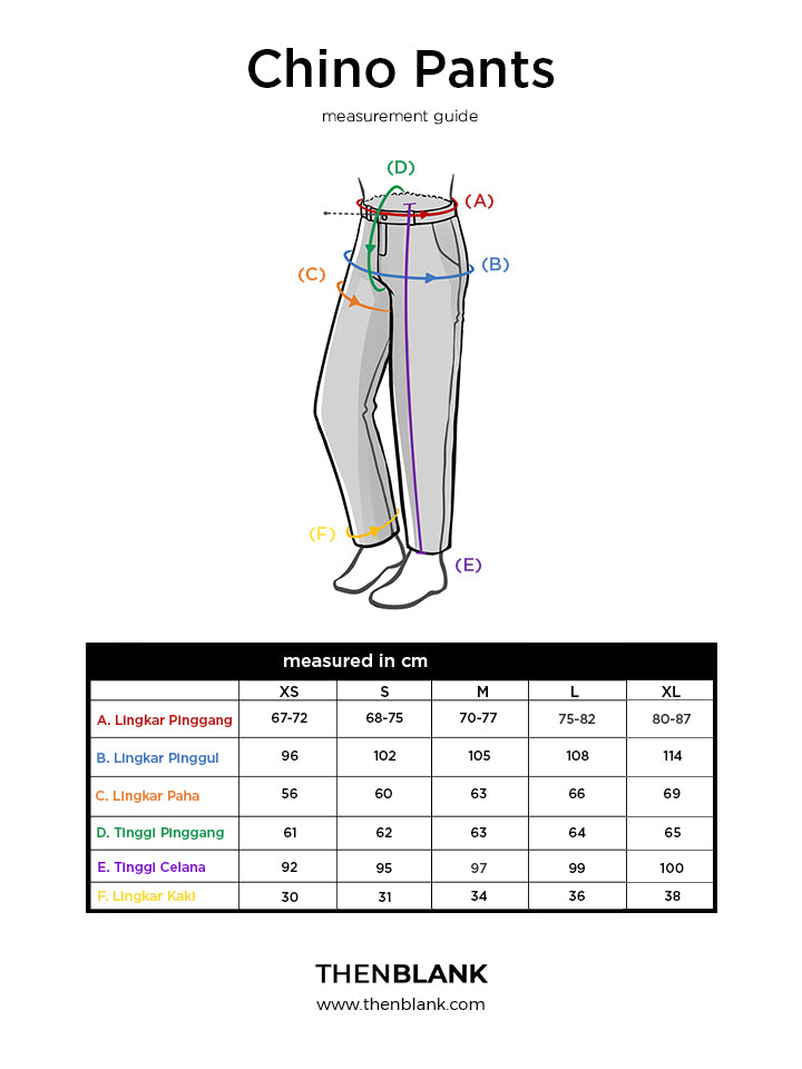 The famous Chino Pants is back! Didesain dengan fit straight cut, serta bahan terbaik yang nyaman saat dikenakan. Terdapat dua saku di sisi kanan dan kiri, ada tempat untuk belt, bagian belakang full karet, menggunakan resleting YKK dan kancing standar jepang, sehingga tidak diragukan lagi kualitasnya, quality guaranteed, perfect stitch.