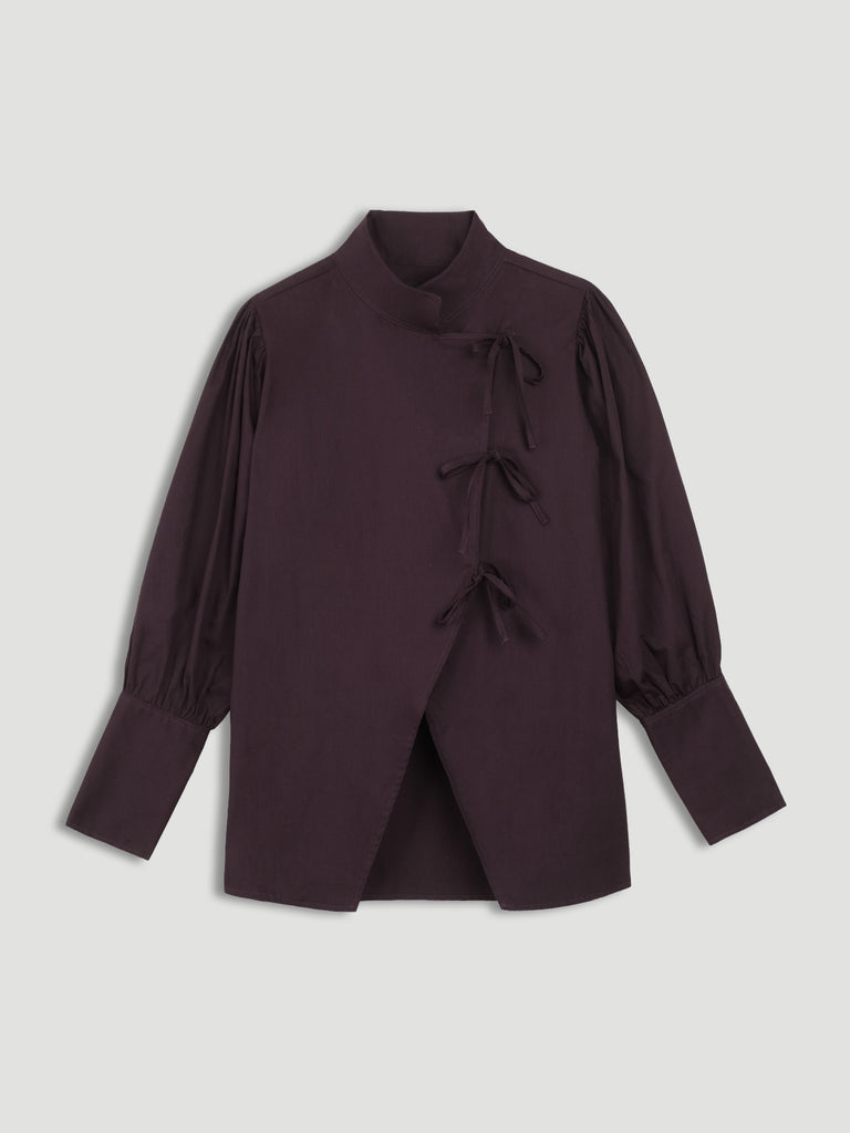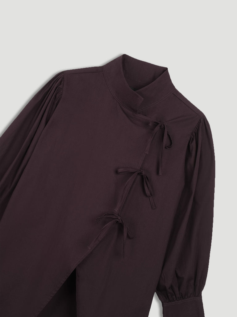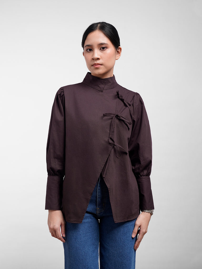 - Mudah dikenakan dengan bukaan hidden button di balik pita