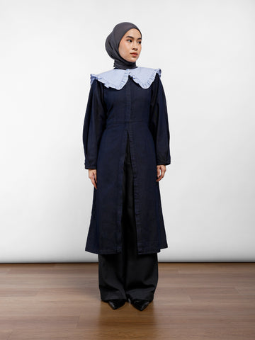 - Terlihat feminin lewat aksen ruffle di tepi kerah.