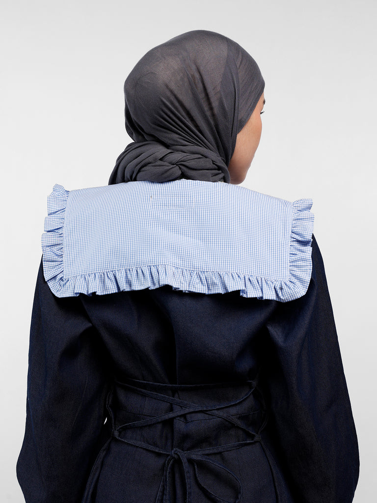- Terlihat feminin lewat aksen ruffle di tepi kerah.