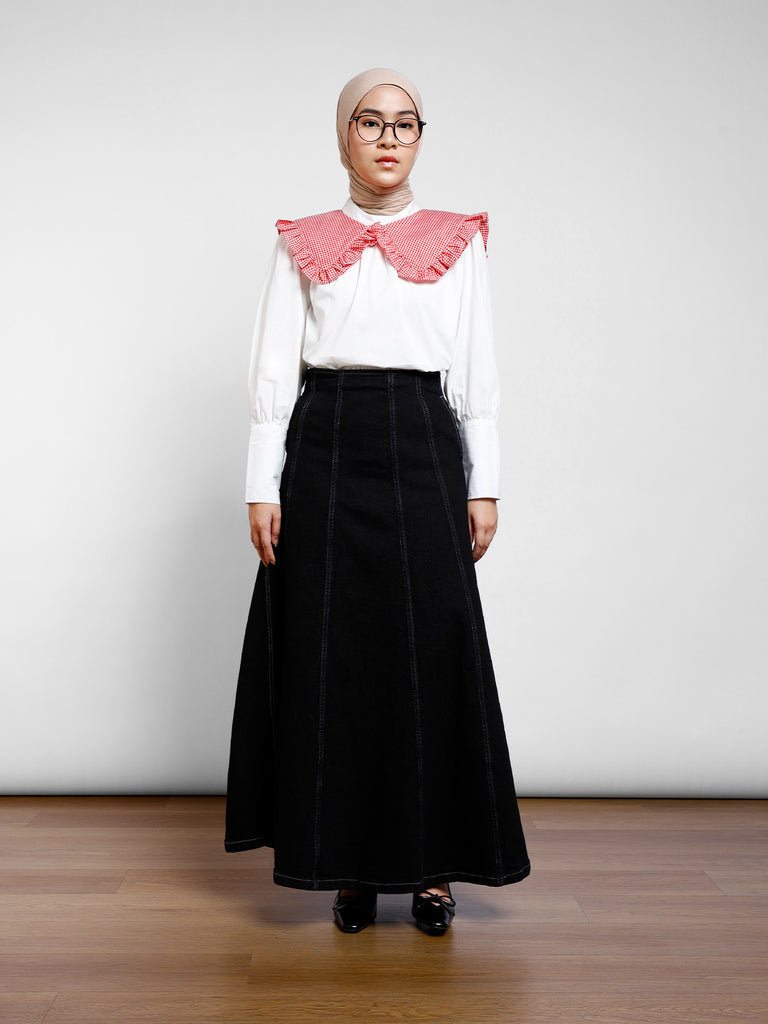 - Terlihat feminin lewat aksen ruffle di tepi kerah.