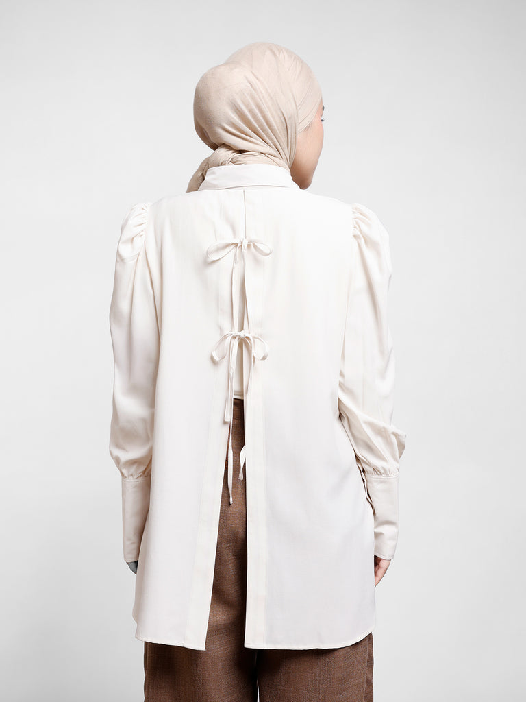 - Puff sleeve dengan manset panjang menambah kesan feminin.
