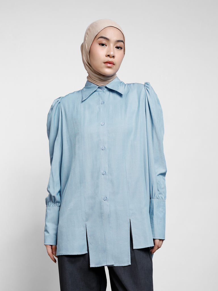 - Puff sleeve dengan manset panjang menambah kesan feminin.