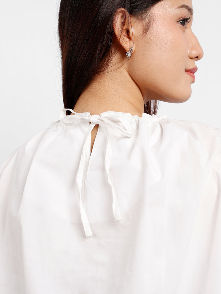 - Terlihat elegan dan feminin dari aksen kerutan di area leher